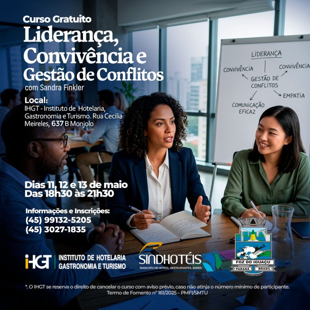 O IHGT – Instituto de Hotelaria, Gastronomia e Turismo de Foz do Iguaçu, por meio do Termo de Fomento nº 161/2025 – PMFI/SMTU, está com inscrições abertas para o curso gratuito Liderança, Convivência e Gestão de Conflitos, que será ministrado por Sandra Finkler. A formação foi estruturada para atender profissionais interessados em desenvolver habilidades de liderança, aprimorar a comunicação no ambiente de trabalho e aprender estratégias para mediação de conflitos e fortalecimento das relações em equipe.