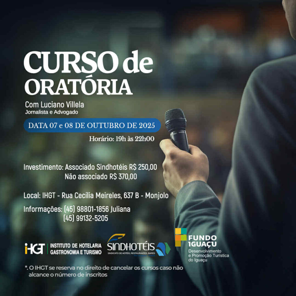 O Instituto de Hotelaria, Gastronomia e Turismo – (IHGT) e o Fundo Iguaçu anunciam a realização do aguardado Curso de Oratória, ministrado pelo experiente jornalista e advogado Luciano Villela. A formação foi desenhada para profissionais e estudantes que buscam aprimorar suas habilidades de comunicação, dominar a arte de falar em público e, com isso, alcançar o êxito em suas carreiras e objetivos pessoais. Com uma abordagem que une teoria e prática, o curso oferece as ferramentas essenciais para transformar a maneira como os participantes se comunicam.