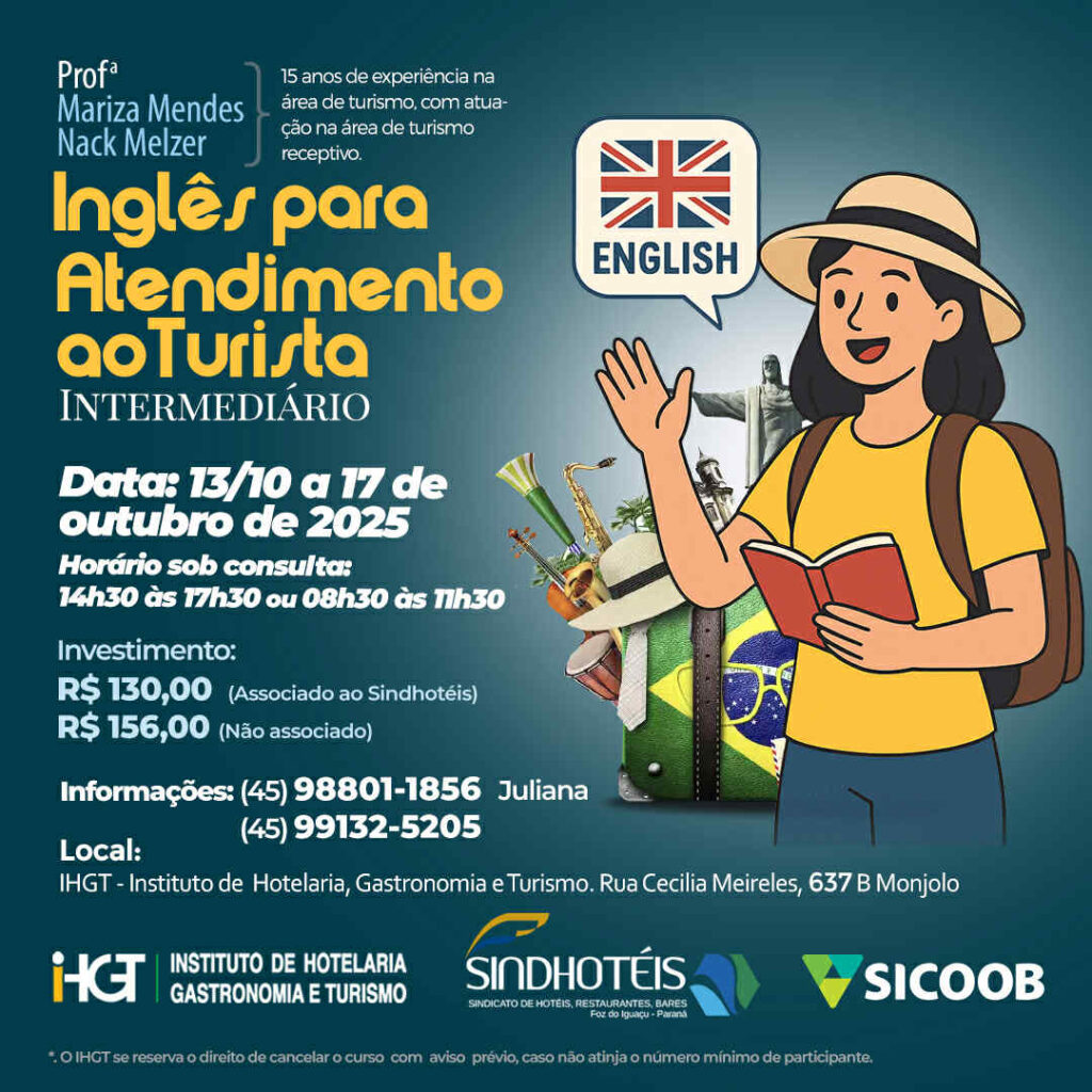 Em um mundo cada vez mais conectado, a fluência em inglês consolida-se como uma habilidade indispensável, especialmente em um polo turístico como Foz do Iguaçu, cuja economia é fortemente impulsionada pelo turismo e pela realização de eventos internacionais. Atentos a essa demanda, o Instituto de Hotelaria, Gastronomia e Turismo (IHGT) e o SICOOB anunciam a abertura de inscrições para o Curso de Inglês Intermediário para Atendimento ao Turista.