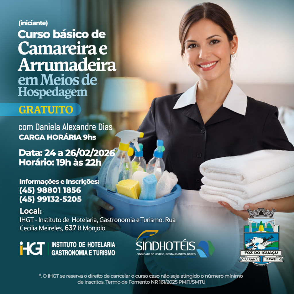 O Instituto de Hotelaria, Gastronomia e Turismo (IHGT) anuncia a realização do Curso Básico de Camareira e Arrumadeira em Meios de Hospedagem para iniciantes, uma iniciativa gratuita que visa a capacitação profissional e a inserção no mercado de trabalho. O curso será ministrado por Daniela Alexandre Dias, profissional com vasta experiência na área de hotelaria.